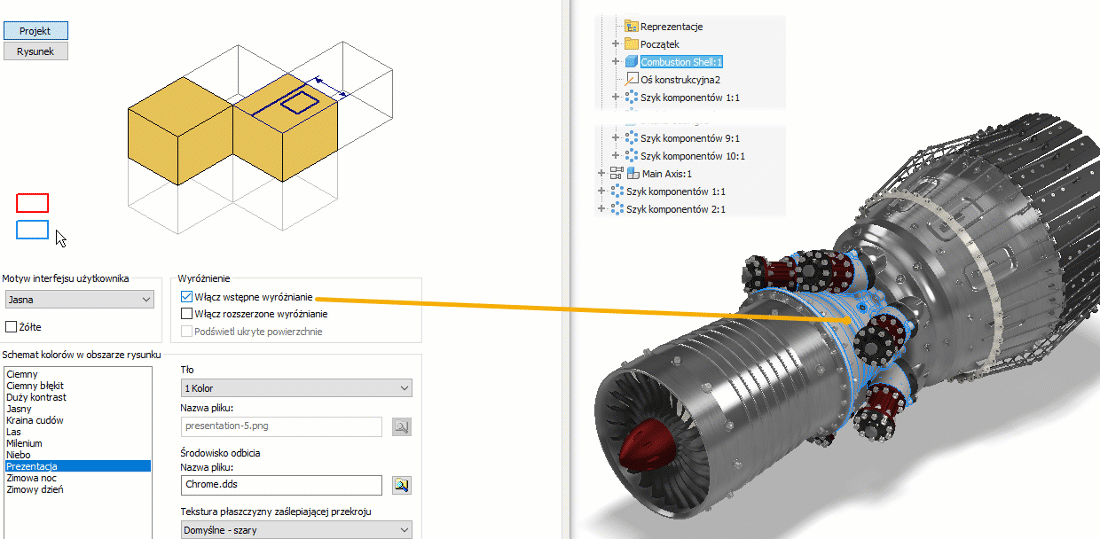 Obiekty są wyróżniane, gdy kursor zostanie przesunięty nad nimi, co pomaga w zidentyfikowaniu elementów, które są wybierane. Domyślnie włączone. Jeśli ta opcja jest wyłączona, wyróżnianie wstępne nie jest wyświetlane w środowiskach zespołu i konstrukcji spawanych dla priorytetów wyboru komponentów lub części.
