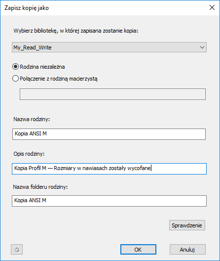 Wybierz bibliotekę do odczytu/zapisu jako bibliotekę, do której ma zostać skopiowana zawartość, zmodyfikuj nazwę rodziny i zmień opisy zgodnie z wymaganiami, a następnie kliknij OK.