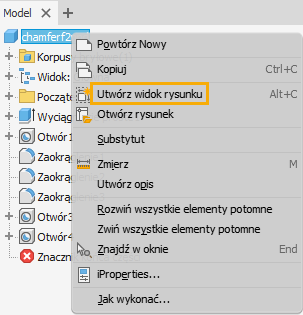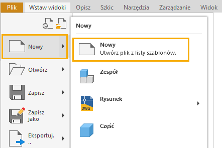 | W pliku części lub zespołu: kliknij prawym przyciskiem myszy nazwę pliku w przeglądarce i wybierz polecenie Utwórz widok rysunku. Zostanie wyświetlone okno dialogowe Utwórz nowy plik. | Aby otworzyć plik standard.idw (Użyj szablonu), kliknij przycisk Utwórz. Można również dwukrotnie kliknąć szablon, aby go otworzyć. |