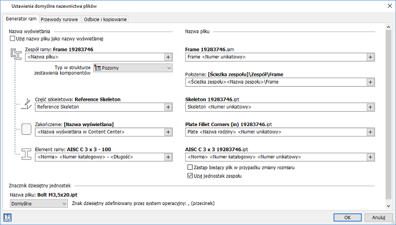Można skonfigurować ustawienia domyślne nazewnictwa plików generatora ram, aby dostosować nazwy i położenie folderów elementów ram.