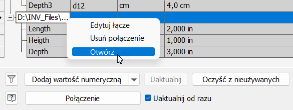 Aby otworzyć połączony plik, kliknij nazwę i ścieżkę pliku prawym przyciskiem myszy w oknie dialogowym Parametry i kliknij przycisk Otwórz.