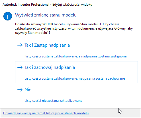 - Tak i Zastąp nadpisania Wybranie tej opcji sprawi, że listy części będą odnosić się do zestawienia komponentów nowego stanu modelu, a istniejące wartości nadpisania zostaną odrzucone.