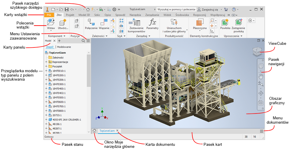 Przeglądarka modelu — panel zawierający komponent, rysunek lub prezentację, które są w danym momencie używane w aktywnym oknie. Przeglądarkę można zakotwiczyć w dowolnym oknie lub pozostawić jako przestawną w obszarze wyświetlania.