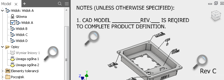 Lista reprezentacji widoku projektu w przeglądarce modeli określa kolejność widoków modelu w wynikowym pliku PDF 3D. Aby zmienić położenie widoku projektu, w przeglądarce przeciągnij widok projektu do wybranego miejsca na liście.