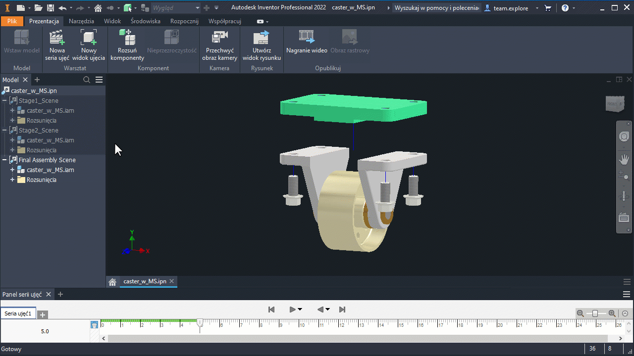Ponadto prezentacja jest aktualizowana, aby odzwierciedlić zmiany w stanie modelu. Przykładowo, jeśli w prezentacji zostaną dodane rozsunięcia, a następnie stan modelu w zespole zostanie wyedytowany, aby wyłączyć więcej części, po powrocie do prezentacji będzie ona odzwierciedlać nowy stan. Jeśli usunięto części będące składowymi rozsunięcia, również i rozsunięcie zostaje usunięte.
