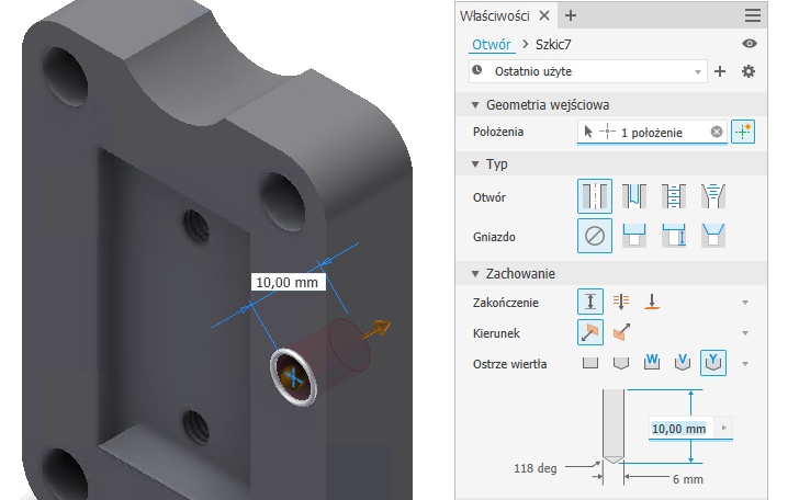 Można szybko umieszczać otwory za pomocą ustawień wstępnych lub określać opcje wymiarów otworu, ostrza wiertła, zakończenia i typu gwintu za pomocą panelu właściwości.