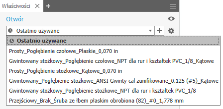 Otwór gwintowany tworzy otwór ze zdefiniowanym gwintem. Określ otwory gwintowane w systemie calowym lub metrycznym. W przypadku otworów w części można wybrać wielkość gwintu z listy standardowych wielkości; jego średnica zostanie obliczona automatycznie.