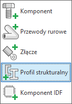 Następujące narzędzia znajdują się na karcie Projekt, w środowisku zespołu i spawania. Tworzenie kształtu strukturalnego znajduje się na karcie Zarządzanie, w środowisku części.