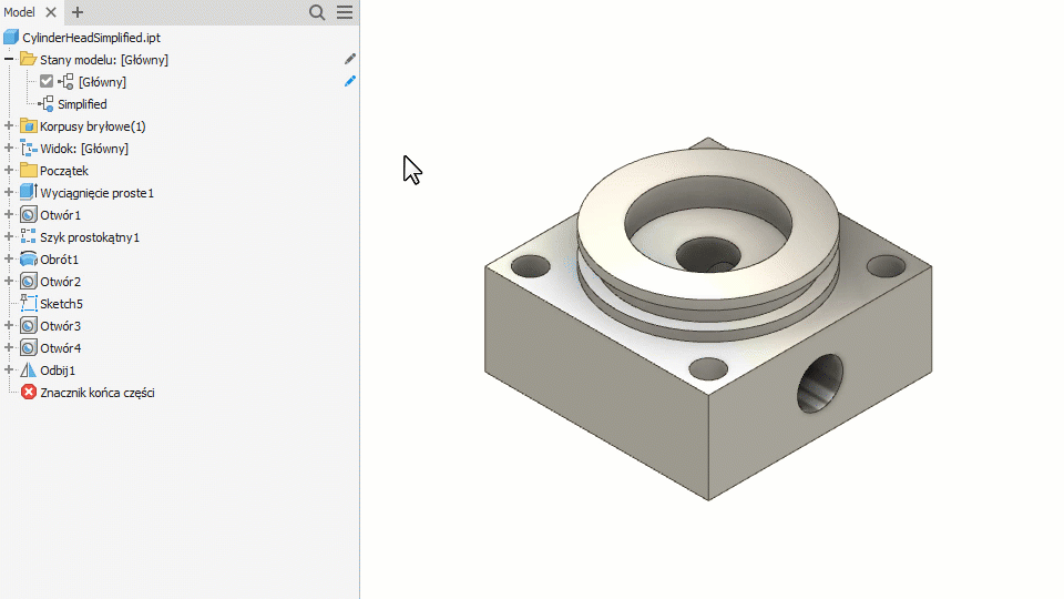 Stany modelu części mogą służyć do rejestrowania procesów produkcyjnych, tworzenia uproszczonych wersji części lub tworzenia rodzin części.