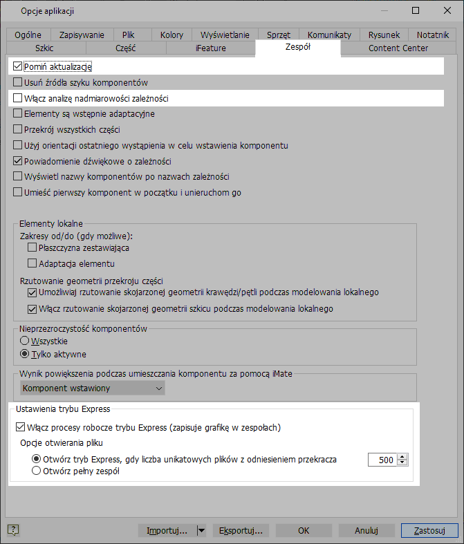 Poniżej znajdują się opcje aplikacji, które mają wpływ na wydajność pracy z zespołem.