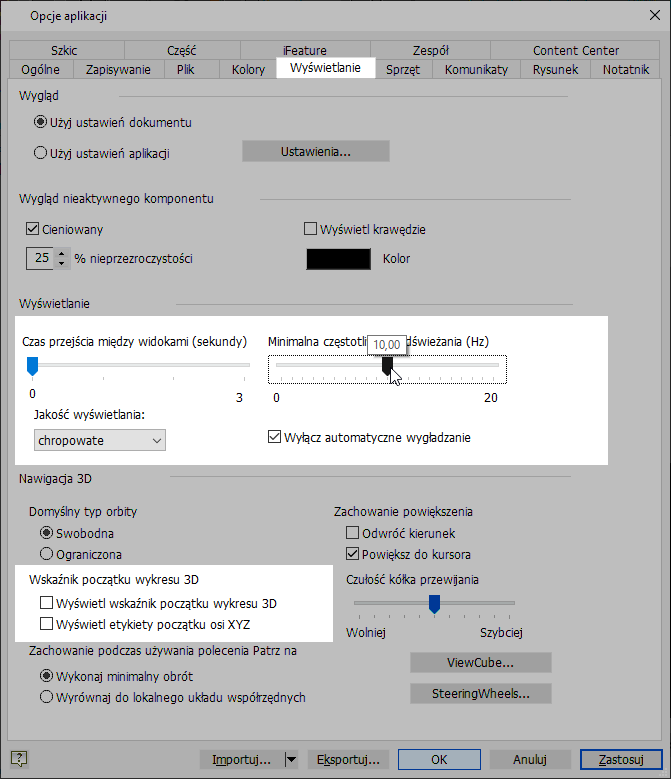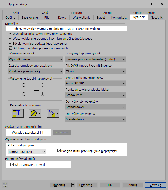 W przypadku szablonów rysunku określ użycie bitmap dla widoków cieniowanych zamiast „Tylko off-line” podczas operacji wyświetlania. Można to zrobić przez otwarcie szablonu rysunku Standard.idw i zapisanie go jako „Standard dużego zespołu.idw”. Na karcie Narzędzia > panel Opcje kliknij przycisk Ustawienia dokumentu. Na karcie Rysunek, w sekcji Widoki cieniowane dla opcji Użyj bitmapy ustaw wartość Zawsze. Zapisz zmiany.