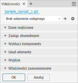 Polecenie Uprość umożliwia utworzenie części z zespołu. Można określić komponenty i elementy, które mają zostać usunięte z uproszczonej części, lub użyć jednego z wbudowanych ustawień wstępnych.