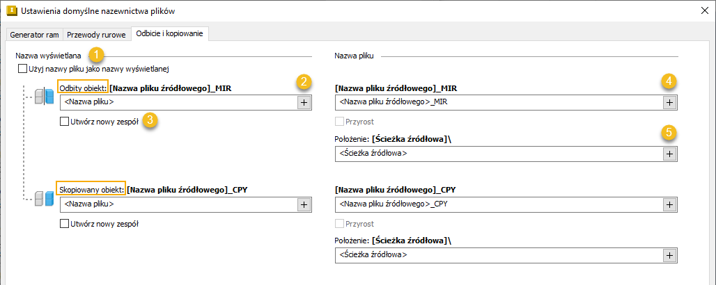 Można określić sposób, w jaki w przypadku polecenia Odbij i Kopiuj tworzone są pliki i foldery.