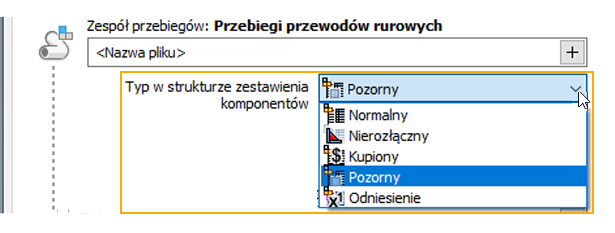 Aby określić typ struktury zestawienia komponentów: Kliknij strzałkę listy rozwijanej Struktura zestawienia komponentów i dokonaj wyboru.