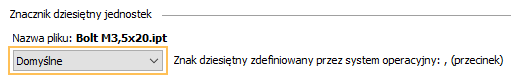 Aby zmienić domyślny znacznik dziesiętny: wybierz znacznik dziesiętny z listy rozwijanej Znacznik dziesiętny jednostek.