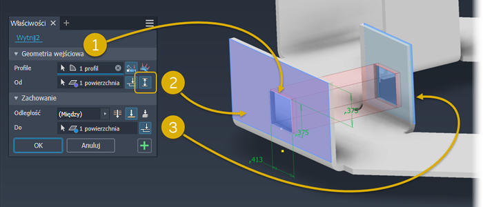 Jeśli opcja nie jest aktywna, kliknij selektor elementu docelowego, a następnie wybierz powierzchnię, na której kończy się element wycięcia.
