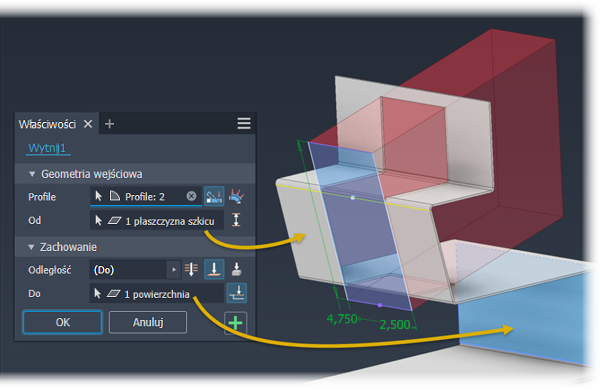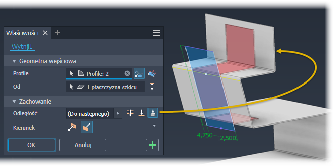 Do następnego: wybiera następną powierzchnię lub płaszczyznę, na których może się zakończyć wyciągnięcie proste w określonym kierunku. Użyj tego selektora, aby wybrać bryłę lub powierzchnię, na której kończy się wycięcie, i określić kierunek.