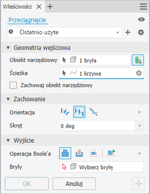 Użycie opcji Zachowaj obiekt narzędziowy powoduje zachowanie obiektu narzędziowego wykorzystywanego w operacji jako bryły niezależnej. Po przeprowadzeniu operacji widoczność zostaje wyłączona. Jeżeli obiekt narzędziowy nie został wybrany, zostanie on użyty i nie będzie go można wykorzystać do wykonywania dalszych operacji.