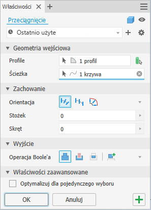 Bryła. Tworzy element bryły z otwartego lub zamkniętego profilu. Profil otwarty nie może być wybrany dla bazowych elementów.Za pomocą narzędzia wyboru toru prowadnicy w oknie graficznym wybierz krzywą lub tor prowadnicy.