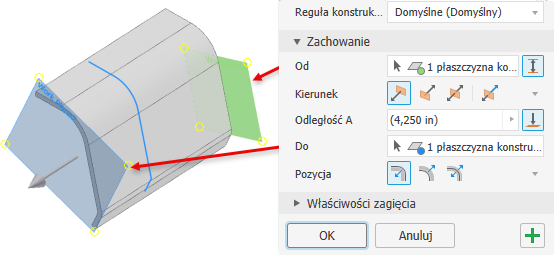 Symetrycznie określa równe odsunięcie od profilu.W grupie Właściwości zagięcia należy określić wartości opcji Promień zagięcia i Reguła rozwijania do użycia.