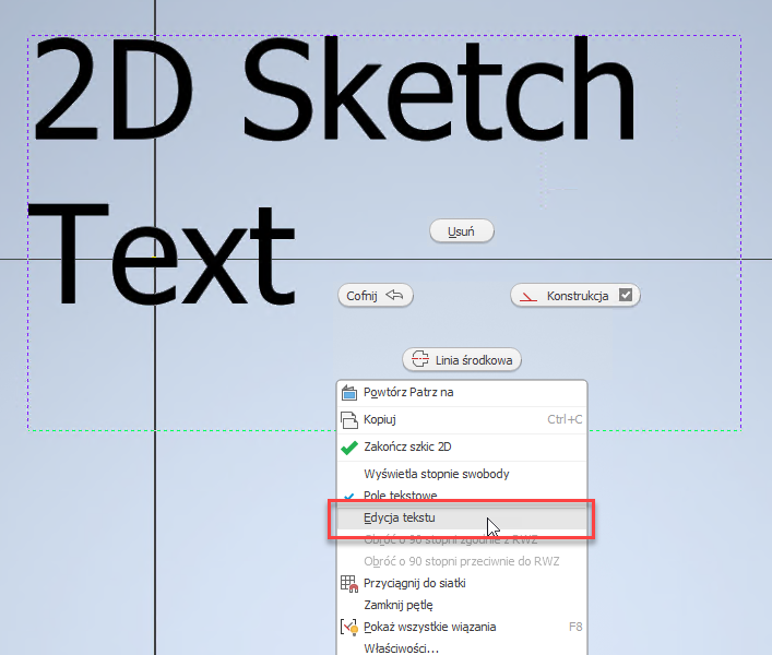 Zarówno w szkicach części, jak i zespołu można edytować tekst bezpośrednio. Najpierw wybierz geometrię ograniczającą — zarówno punkty, jak i linie. Następnie kliknij prawym przyciskiem myszy i wybierz polecenie „Edytuj tekst” lub „Edytuj ramkę”.