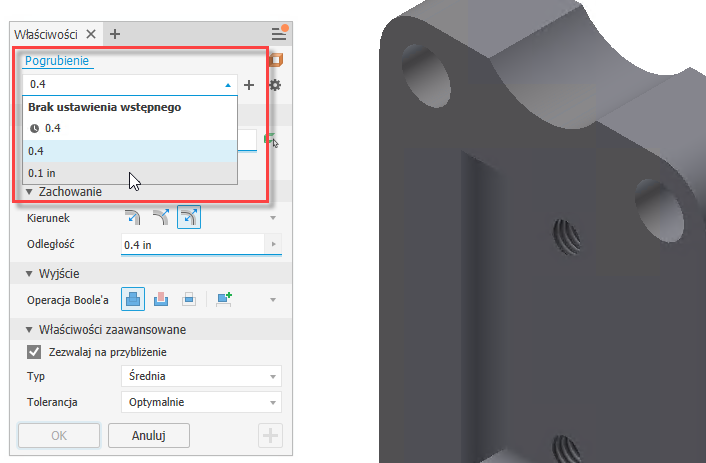 Aby uzyskać więcej informacji, zobacz tematy Przypisanie wykończenia do komponentu, Tworzenie otworów, Tworzenie gwintów.