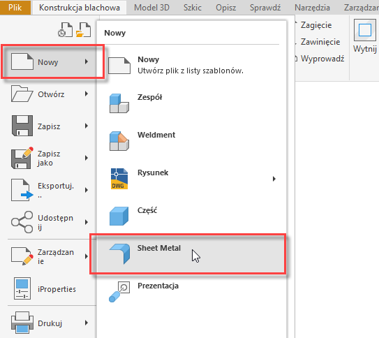 Dostęp do konstrukcji blachowej z menu „Plik > Nowy”
