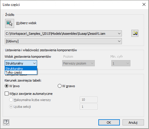 Na liście części starsze metody tworzenia listy części są usuwane z listy rozwijanej. Jeśli jest konieczne wyświetlenie starszych list części, można podać klucz rejestru.