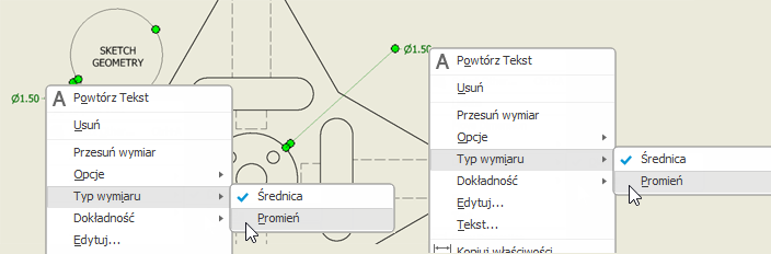 Edytuj istniejące wymiary średnicy lub promienia, aby zmienić ich typ. Można to zrobić z wymiarami rysunkowymi, które: