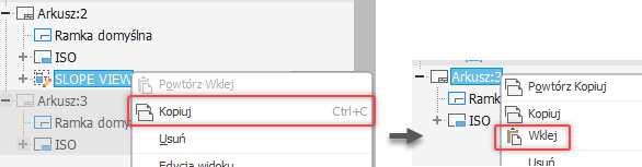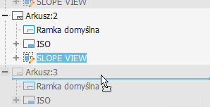 Łatwo przenoś widoki szkicowane do innego arkusza. Kliknij i przeciągnij węzeł przeglądarki z aktywnego arkusza do arkusza docelowego.