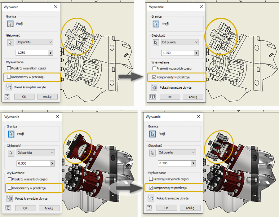Uczestnictwo w widoku: podczas tworzenia lub edycji widoku można wybrać, czy komponenty w odciętej objętości są wyświetlane w widoku wyrwania.