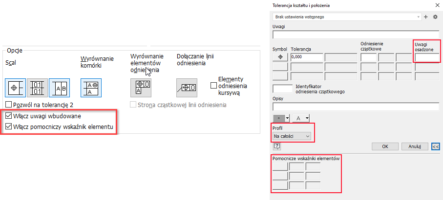 W oknie dialogowym Styl tolerancji kształtu i położenia dodano dodatkowe identyfikatory zgodne ze standardami ISO 5458, ISO 14405-1:2016 i ISO 1101.