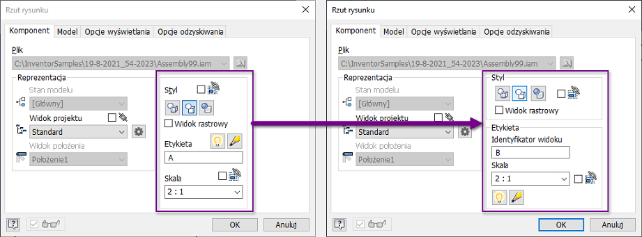 W oknie dialogowym Widok rysunku zaktualizowano interfejs etykiety widoku.