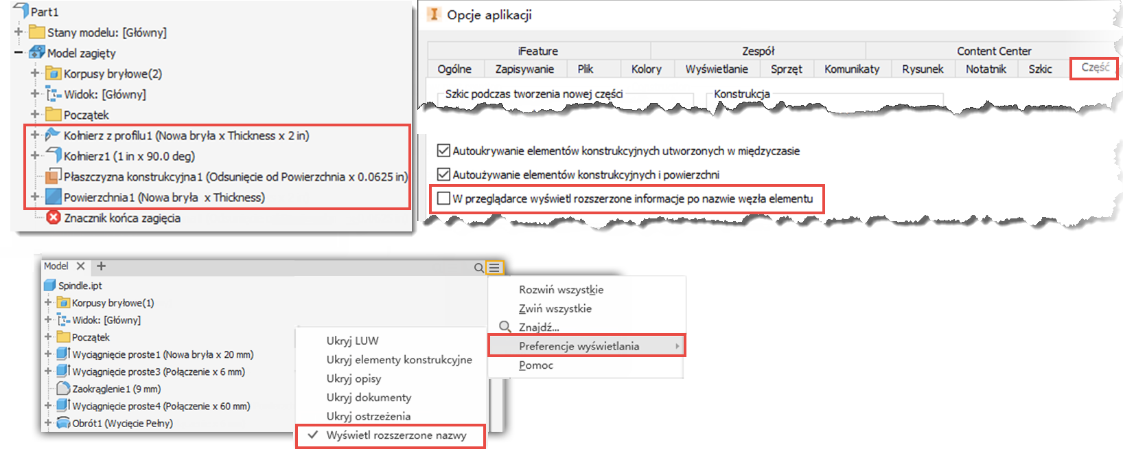 Konstrukcje blachowe: rozszerzone informacje przeglądarki są dostępne w przypadku części konstrukcji blachowych. Opcję tę można aktywować z poziomu menu Opcje aplikacji > karta Część lub z poziomu węzła przeglądarki.