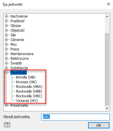 Twardość to zupełnie nowy typ jednostki dodany do tego wydania programu Inventor. Pozwala on na określenie twardości w poleceniu Wykończenie, ale może być również używany samodzielnie. W oknie dialogowym Parametry dostępne są następujące typy: