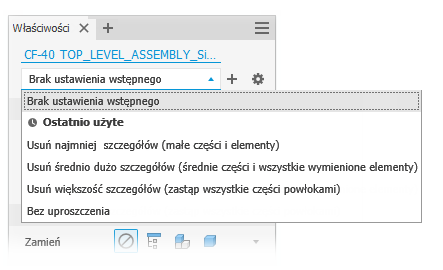 Nowe polecenie Uprość zastępuje polecenia Powłoka i Zastąpienie powłoką. Polecenie Uprość umożliwia usunięcie komponentów i elementów ze złożonych zespołów w celu ułatwienia współpracy i dalszego wykorzystania.