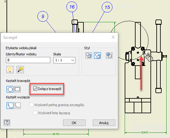Teraz można bardzo łatwo ustawić widok szczegółu w punkcie podczas tworzenia. Zaznacz nowo dodane pole „Dołącz krawędź” w oknie dialogowym Widok szczegółu i wybierz punkt, do którego ma zostać naprawiony widok szczegółu.
