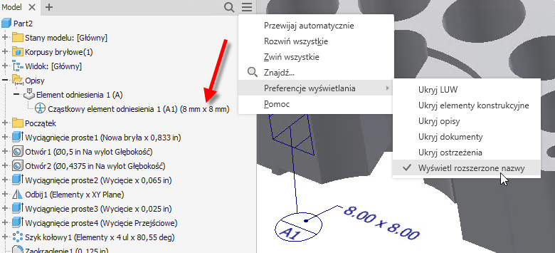Węzeł przeglądarki Cząstkowy element odniesienia wyświetla teraz rozmiar docelowy podczas używania opcji rozszerzonej nazwy.