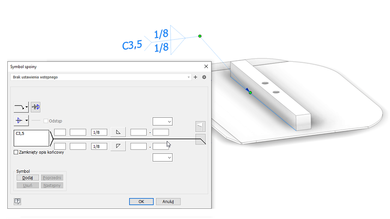 Wiele symboli spoin 2D na rysunkach zostało zaktualizowanych zgodnie ze standardami ISO/BSI/DIN/GB. W przypadku symbolu spoiny 3D w zespołach ma on zastosowanie do standardów ISO/DIN. Zmiany obejmują aktualizację nazw pól i dodanie nowych pól w zależności od wybranego typu spoiny. Zmiany zostały wprowadzone na przykład w przypadku spoin I, spoin pachwinowych i spoin otworowych.