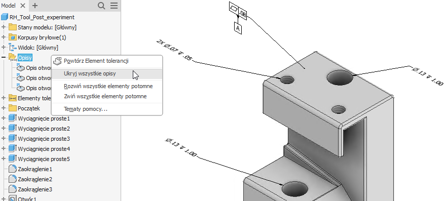 Wszystkie opisy 3D są umieszczane w folderze w przeglądarce modelu. Wszystkie opisy 3D można ukryć za pomocą opcji Ukryj wszystkie opisy w menu kontekstowym folderu.