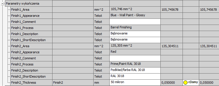 Każde ustawienie elementu wykończenia ma parametr o odpowiadającej mu niepowtarzalnej nazwie w kategorii „Parametry wykończenia” w oknie dialogowym Parametry. Wszystkie parametry wykończenia można eksportować. Wyeksportowane parametry są wyświetlane w iProperties. Należy pamiętać, że zmiana właściwości iProperties nie wpływa na parametry elementu wykończenia modelu.