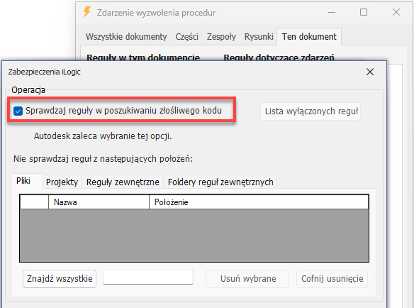 Jeśli reguła uruchamiana na zdarzeniu spowoduje wystąpienie błędu, wpisanie zostanie anulowane i przed kontynuowaniem wpisywania należy naprawić błąd. Jeśli wystąpi błąd w pliku macierzystym (na przykład w zespole), wpisywanie plików potomnych (takich jak części) również zostanie anulowane, i na odwrót. Jeśli do zdarzenia dołączona jest reguła zewnętrzna i ta reguła zewnętrzna nie zostanie znaleziona podczas wpisywania, wówczas wpisanie zostanie anulowane. Błąd w pojedynczym pliku anuluje całą operację wpisywania.