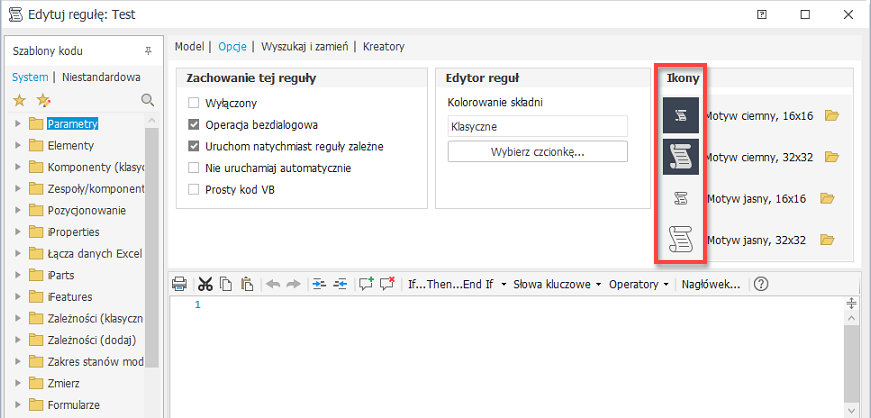 Na karcie Opcje edytora reguł (dla reguły zewnętrznej) wyświetlane są bieżące ikony. Kliknięcie przycisku folderu spowoduje otwarcie okna dialogowego, gdzie można wybrać inny plik bitmapy z dowolnego folderu. Wybrany plik zostanie skopiowany do tego samego folderu co reguła, a nazwa zostanie zmieniona zgodnie z konwencją nazewnictwa. Zalecana rozdzielczość obrazu (w pikselach) wynosi 16 × 16 w przypadku małych obrazów i 32 × 32 w przypadku dużych obrazów. Inne rozmiary zostaną jednak automatycznie przeskalowane.