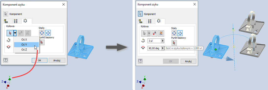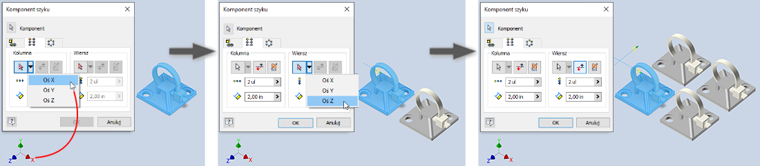 Aby przyspieszyć tworzenie szyków za pomocą osi początkowych, osie są teraz dostępne w oknie dialogowym Szyk. Kliknij selektor, aby uzyskać dostęp do menu rozwijanego osi.