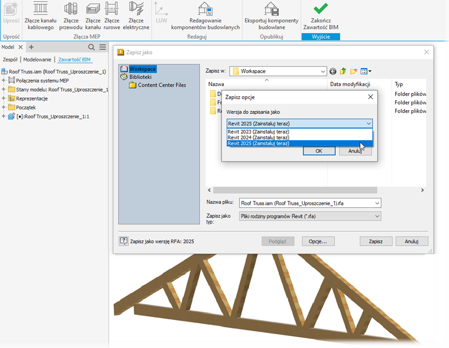 Podczas eksportowania plików programu Revit (*.RVT) za pomocą polecenia Uprość wybierz wersję z listy rozwijanej.