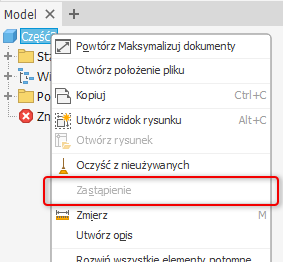 Zmiana ta ma wpływ na dokumenty części. Dlatego też, nawet w nowym dokumencie części, menu kontekstowe wyświetla stan Zastąpienie tylko do odczytu. To pole nie jest zaznaczone.