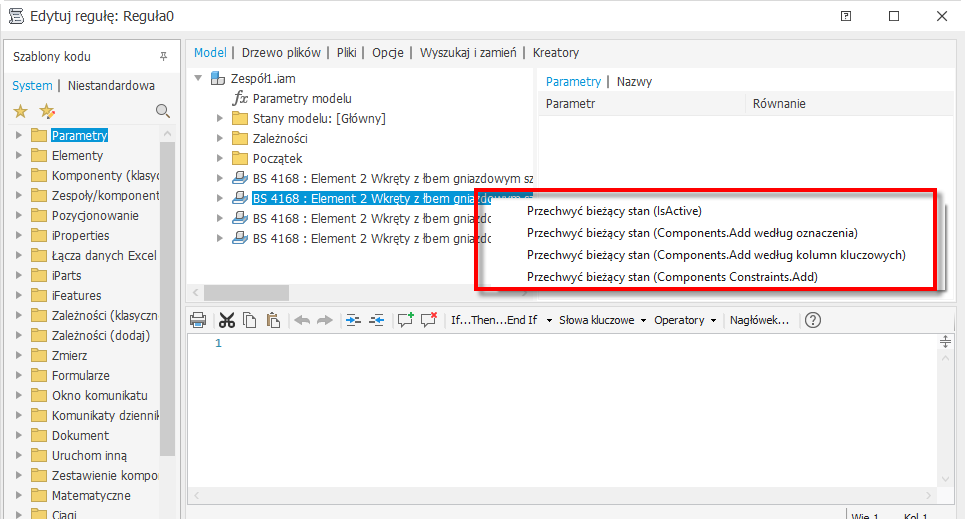 Nowa opcja przechwytywania bieżącego stanu została dodana do Edytora reguł iLogic dla części Content Centre. Zamiast przechwytywać określenie, otrzymuje ona wartości kluczowe i dostarcza kod z listą nazwa-wartość. Ułatwia to określenie poszczególnych wymaganych wartości, zamiast łączenia ich w jedną wartość określenia.