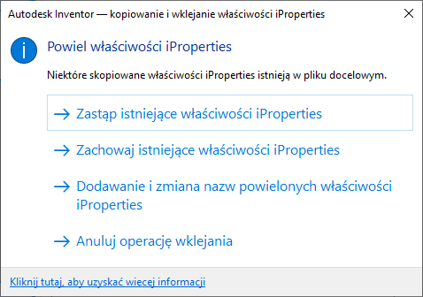 Podczas wklejania właściwości do innego dokumentu, w przypadku występowania duplikatów zostanie wyświetlony monit o wykonanie czynności: