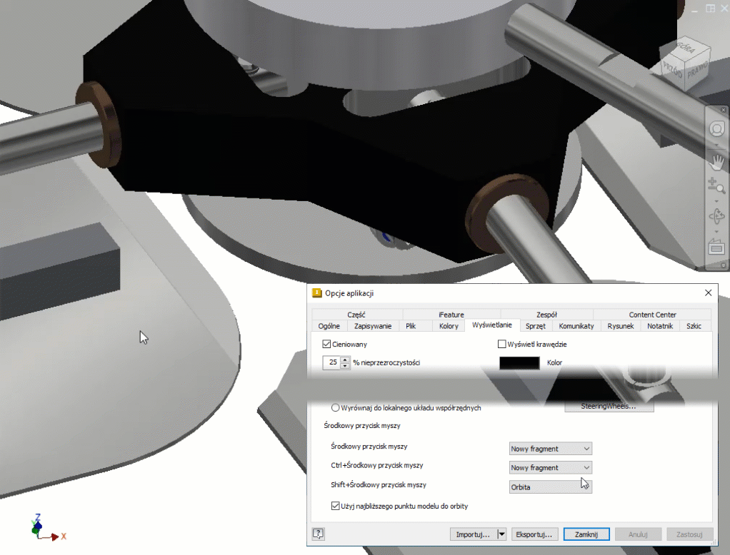 Nowa opcja aplikacji umożliwiająca określenie, czy podczas obracania modelu w obszarze rysunku ma być używany punkt obrotu. Jeśli opcja nie jest zaznaczona, używane jest starsze zachowanie orbity.
