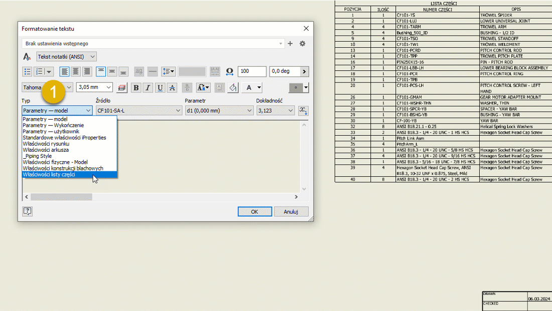 Do okna dialogowego Tekst dodano możliwość dodawania właściwości listy części do dowolnego tekstu rysunku.